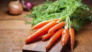 La zanahoria aporta betacarotenos y antioxidantes que facilitan la eliminación de toxinas y protegen la piel y los órganos internos. Se puede consumir cruda, en jugos o al vapor.
